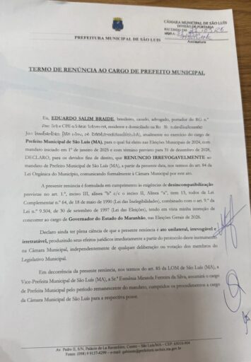 Eduardo Braide não é mais o prefeito de São Luís. A Câmara Municipal realizou nesta terça-feira (31) a leitura oficial do documento em que ele renuncia ao cargo. Com a oficialização, a vice-prefeita Esmênia Miranda assumiu o comando da capital maranhense em sessão realizada às 16h.
