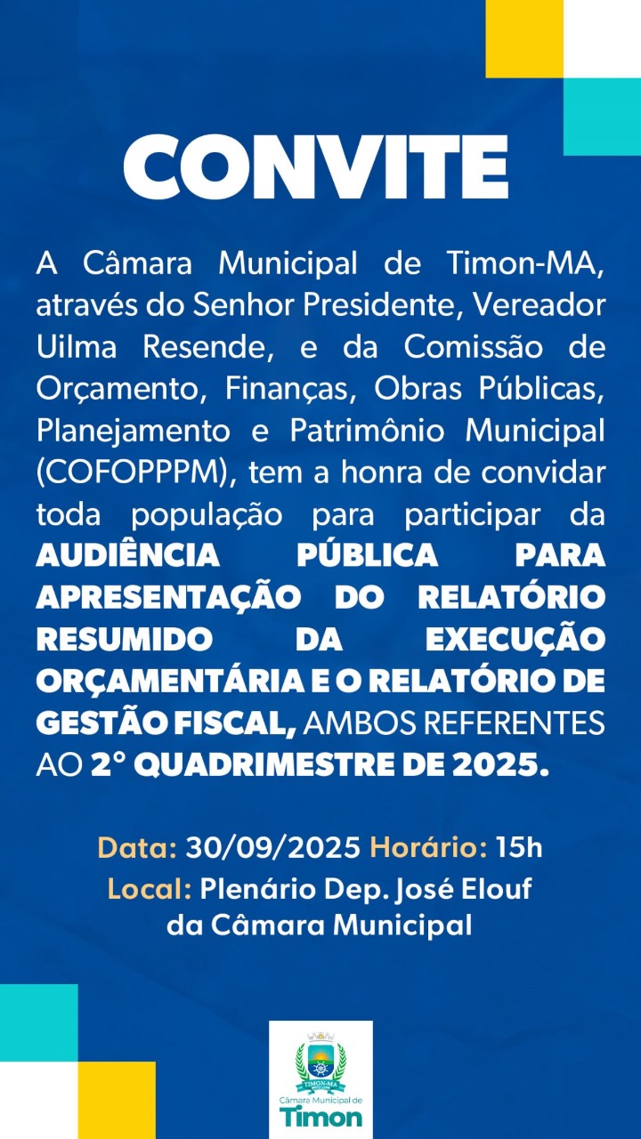 A Câmara Municipal de Timon realiza nesta terça-feira (30), às 15h, audiência pública para apresentação do Relatório Resumido da Execução Orçamentária e do Relatório de Gestão Fiscal referentes ao 2º quadrimestre de 2025.