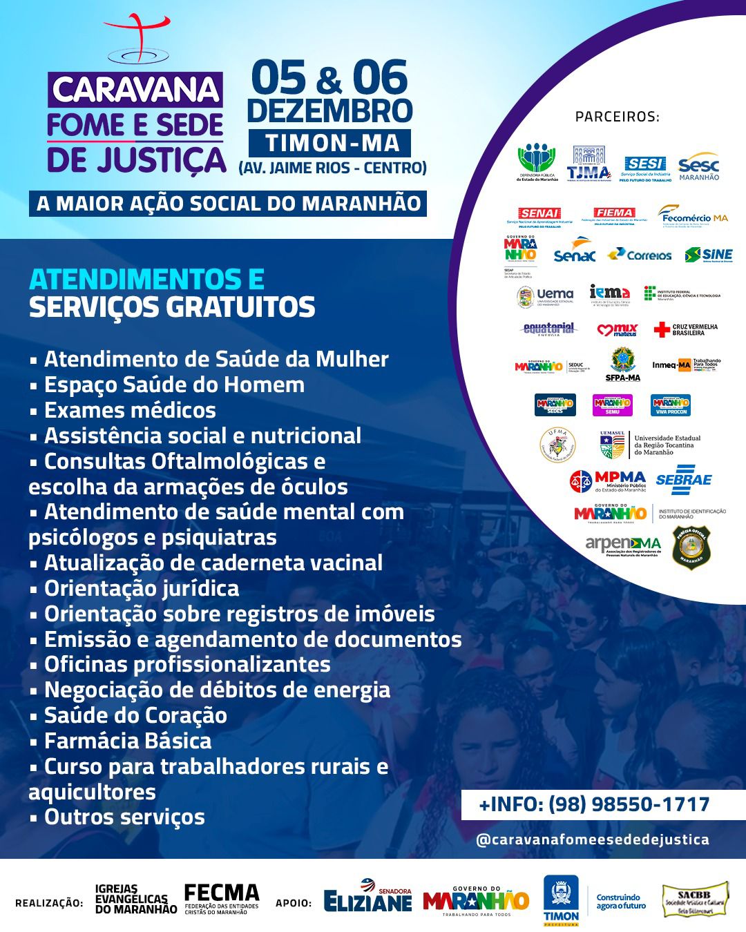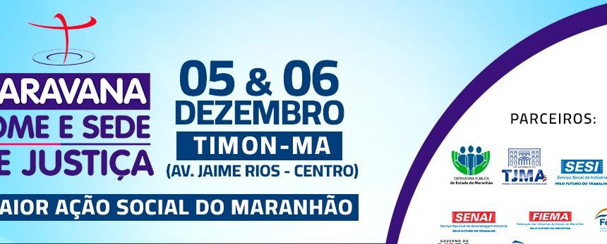 Timon recebe, nos dias 05 e 06 de dezembro, a Caravana Fome e Sede de Justiça, considerada a maior ação social do Maranhão. A programação será realizada na Avenida Jaime Rios, no Centro, com oferta de serviços gratuitos para toda a população.