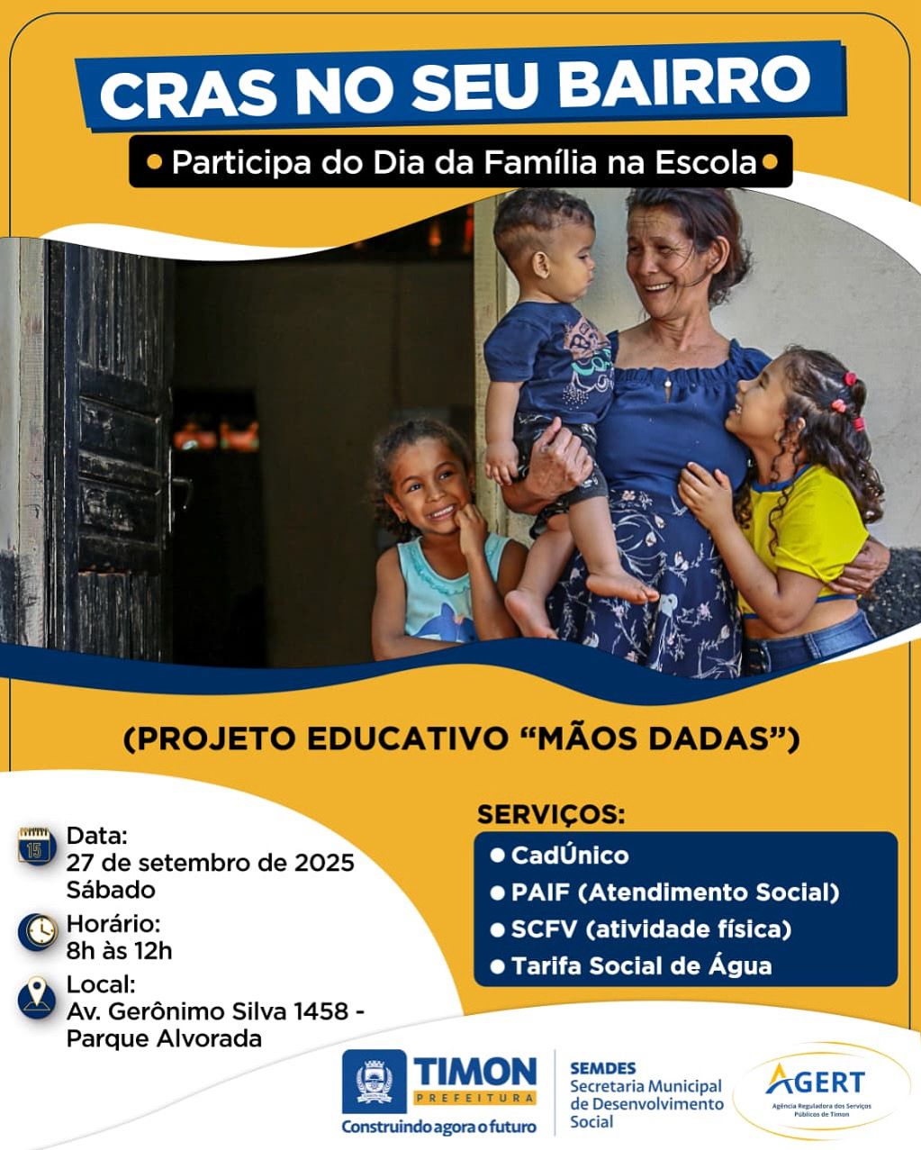 A comunidade do Parque Alvorada, em Timon, recebe neste sábado (27) mais uma edição do projeto “CRAS no Seu Bairro”, que desta vez participa do Dia da Família na Escola, com programação especial voltada à cidadania, assistência social e fortalecimento dos vínculos familiares.