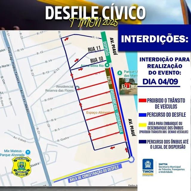 A Prefeitura de Timon também ressalta a importância de prestar atenção ao trânsito. No dia do desfile, a extensão da Avenida Piauí e as ruas adjacentes estarão parcialmente interditadas. Por isso, recomenda-se que as pessoas saiam de casa mais cedo e usem rotas alternativas para evitar inconvenientes.
