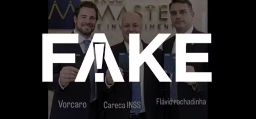 Uma foto está circulando nas redes sociais mostrando Daniel Vorcaro, dono do Banco Master, ao lado do senador Flávio Bolsonaro (PL) e de Antonio Carlos Camilo Antunes, conhecido como “Careca do INSS”. Na imagem, os três aparecem segurando um cartão de crédito do banco. Porém, essa foto é completamente falsa. Ela foi criada por inteligência artificial, tecnologia capaz de gerar imagens que parecem reais, mas que nunca aconteceram.