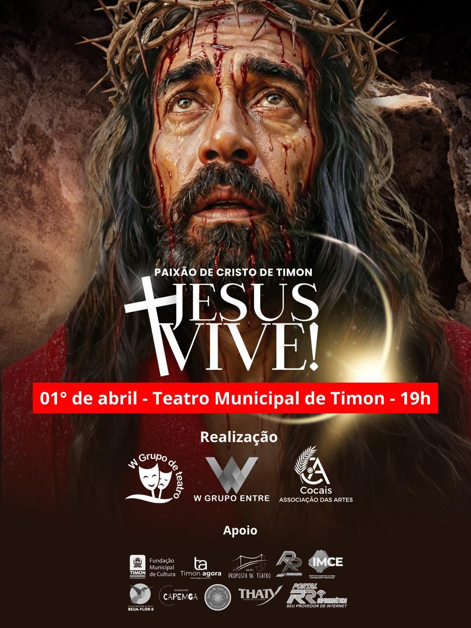 Os moradores de Timon podem assistir gratuitamente a uma peça de teatro sobre a história de Jesus Cristo nesta quarta-feira (1º). O espetáculo “Jesus Vive” será apresentado às 19h no Teatro Municipal Socorro de Macêdo Claudino, com entrada livre para toda a população.