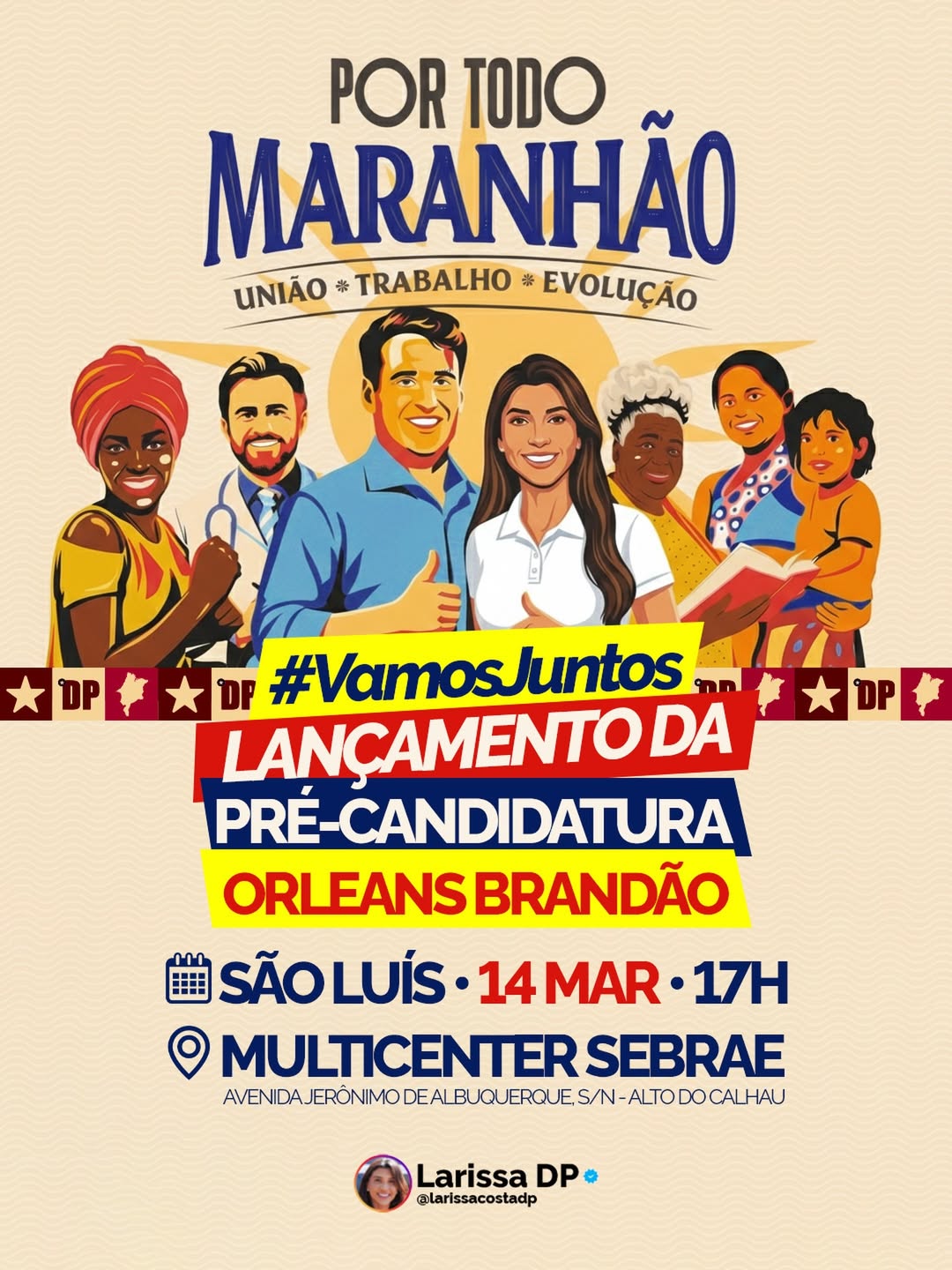 Nas redes sociais, Larissa DP reforçou o convite e afirmou que o momento será importante para marcar o início de uma nova etapa na política maranhense. Segundo ela, o evento simboliza união e mobilização em torno de propostas que buscam fortalecer o desenvolvimento do estado. A pré-candidata também destacou a expectativa de encontrar apoiadores e lideranças que acreditam no projeto liderado por Orleans Brandão.