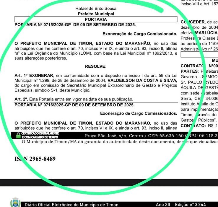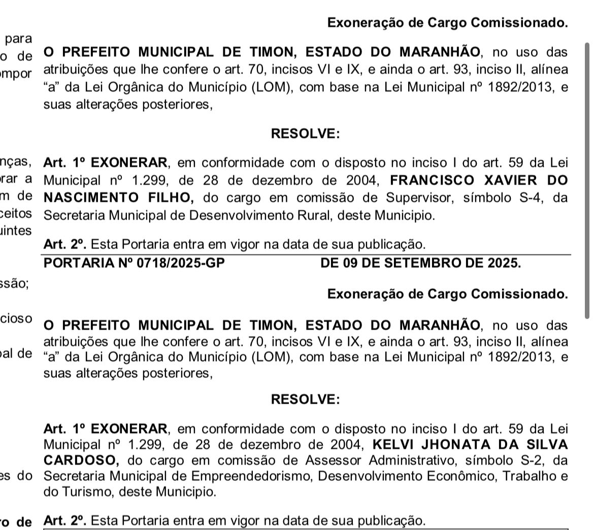 O prefeito de Timon, Rafael Brito, promoveu mudanças em sua equipe administrativa nesta terça-feira (9), ao exonerar dois auxiliares do governo municipal. A decisão alcançou Dedé do Povo, que ocupava a Secretaria Extraordinária de Projetos Especiais, e James Cebolão, suplente de vereador que exercia a função de assessor.