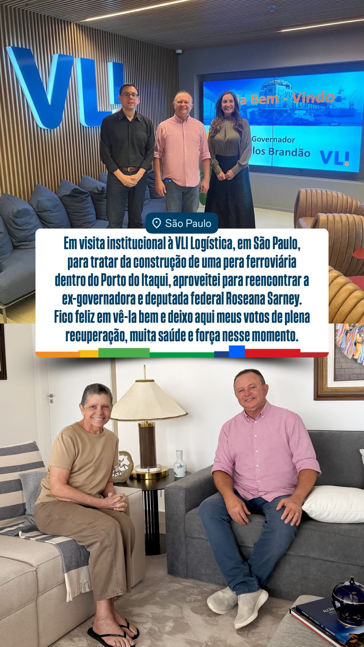 O governador do Maranhão, Carlos Brandão, visitou a deputada federal Roseana Sarney nesta terça-feira (7) em São Paulo. O encontro aconteceu após o governador participar de uma reunião na sede da VLI Logística para discutir a construção de uma pera ferroviária no Porto do Itaqui, estrutura que facilita manobras de trens no terminal portuário maranhense.