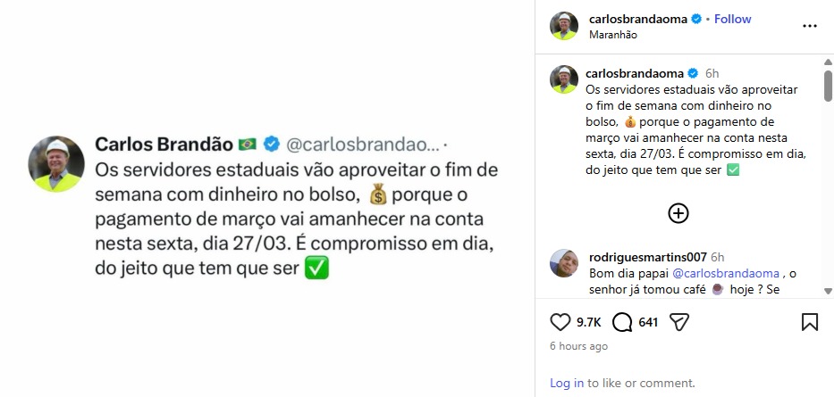 O governador Carlos Brandão anunciou que os servidores públicos estaduais do Maranhão terão o salário de março depositado nesta sexta-feira (27). A antecipação do pagamento permite que os funcionários públicos aproveitem o fim de semana com o dinheiro já disponível na conta bancária.