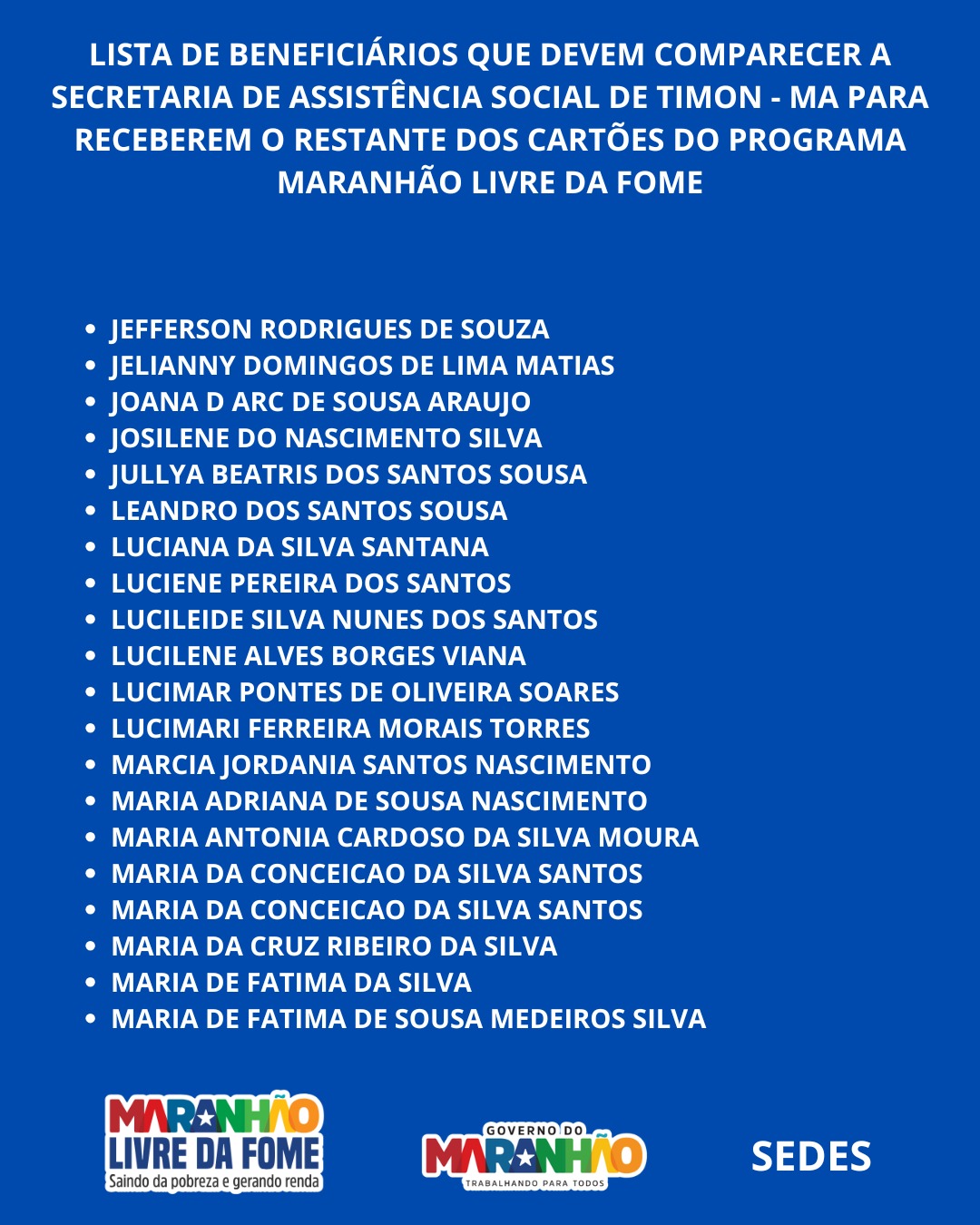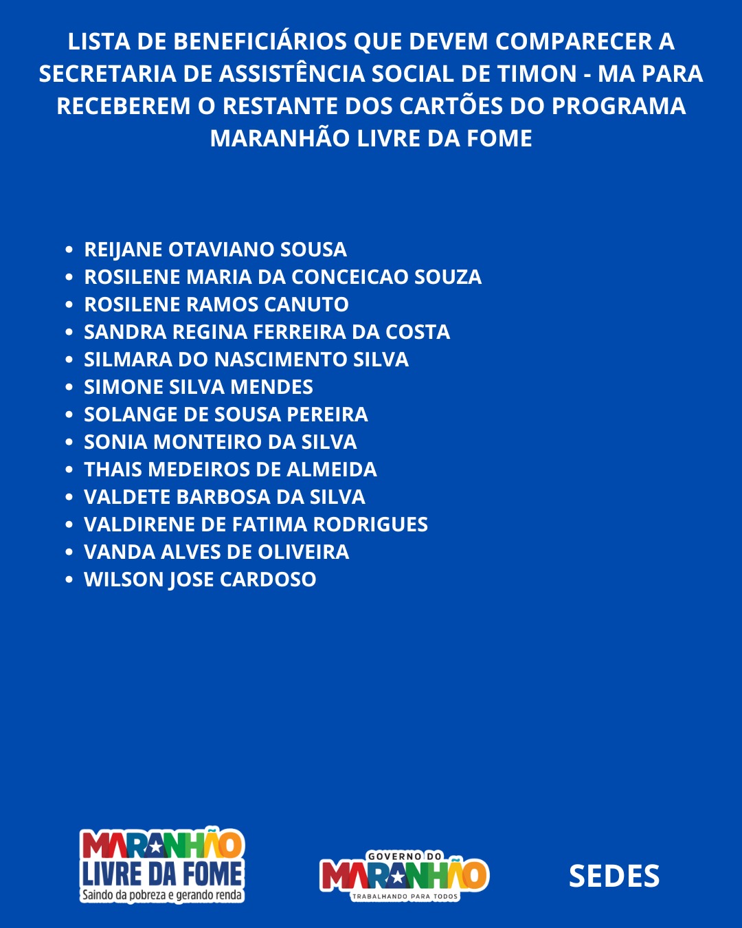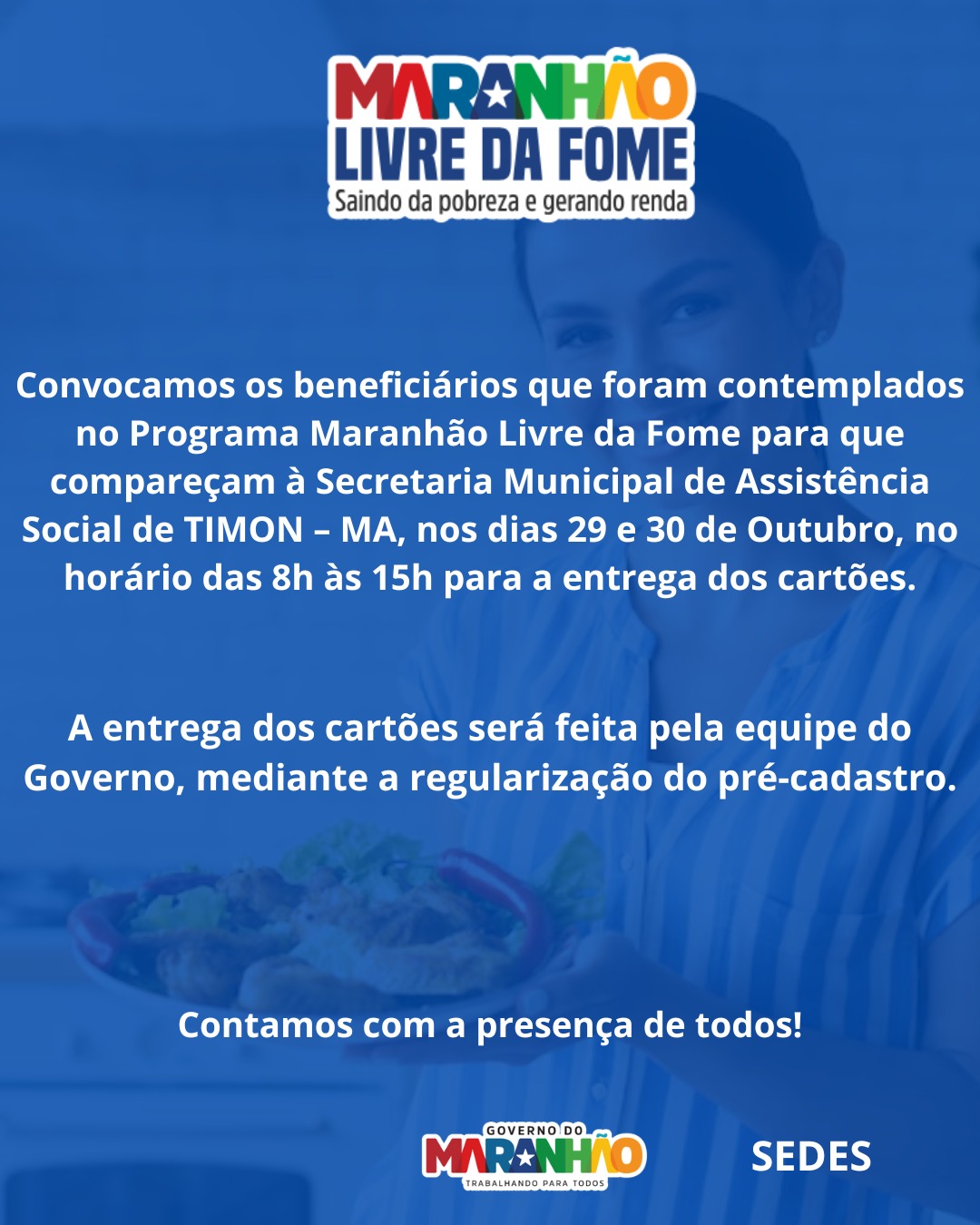 O Governo do Maranhão, por meio da Secretaria de Estado do Desenvolvimento Social (SEDES) e da Secretaria de Assuntos Municipais (SAMU), realizou nesta quarta-feira (29) uma nova etapa de entrega dos cartões do programa Maranhão Livre da Fome em Timon.