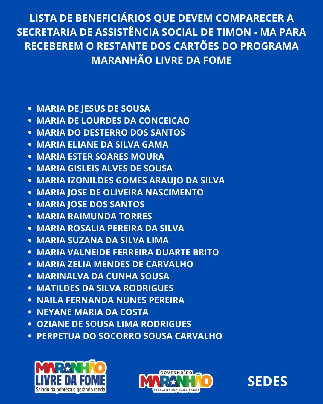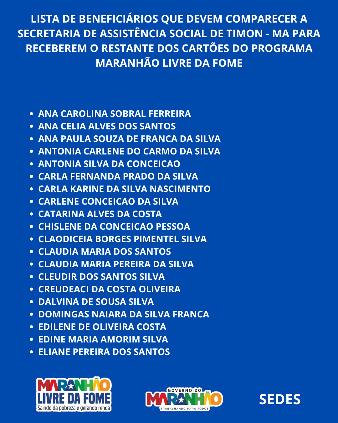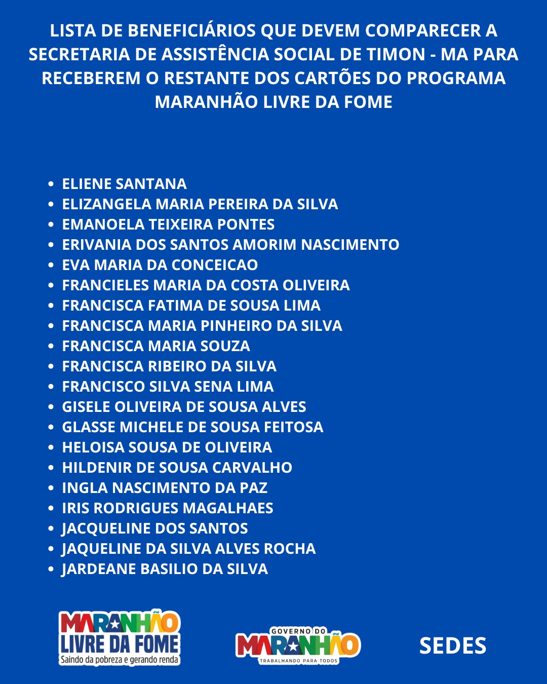 O Governo do Maranhão, por meio da Secretaria de Estado do Desenvolvimento Social (SEDES) e da Secretaria de Assuntos Municipais (SAMU), realizou nesta quarta-feira (29) uma nova etapa de entrega dos cartões do programa Maranhão Livre da Fome em Timon.