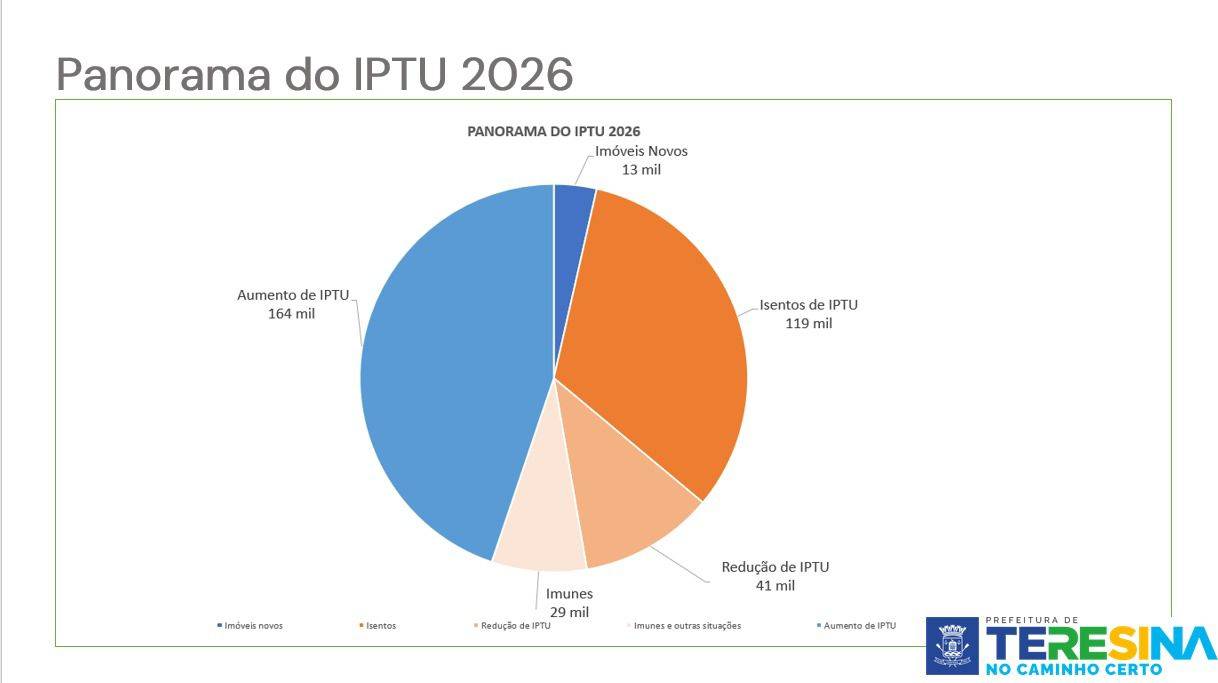 Dos 364 mil imóveis cadastrados em Teresina, 119 mil são isentos do IPTU e agora também ficarão livres da taxa de coleta de lixo. Outros 41 mil tiveram redução no valor do imposto, 29 mil são legalmente imunes (como igrejas e prédios públicos) e 13 mil são imóveis novos no cadastro municipal.