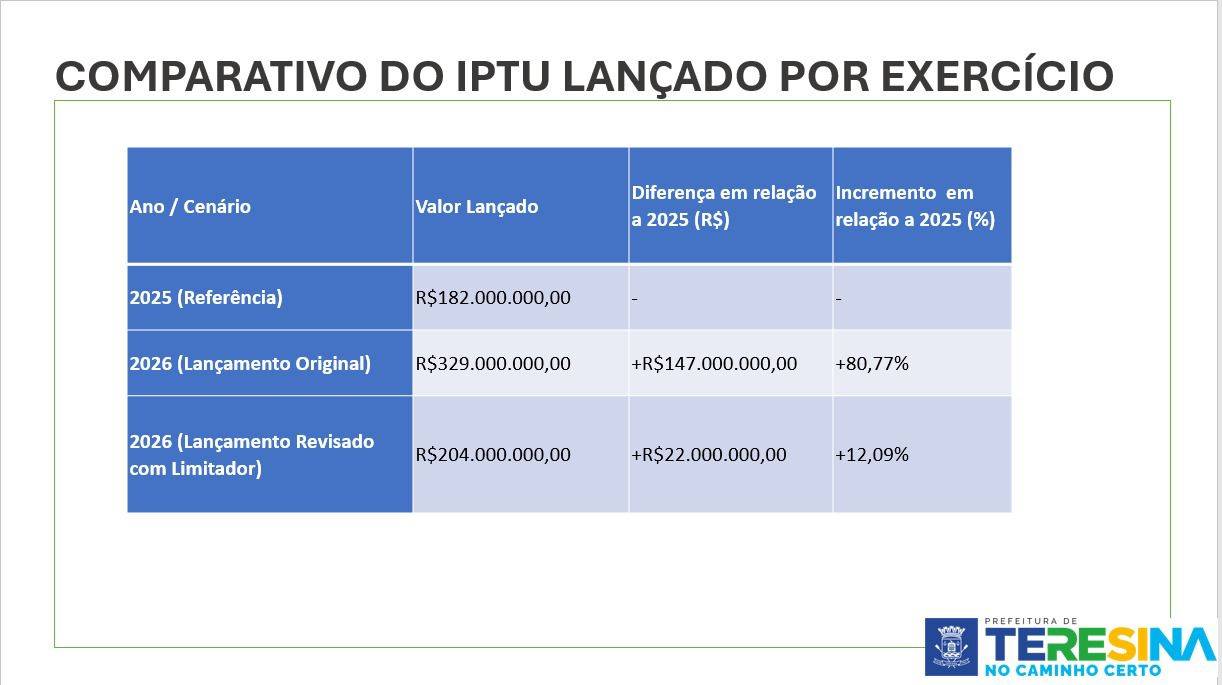 A Prefeitura de Teresina anunciou nesta quarta-feira (11) mudanças na cobrança do IPTU para 2026. O IPTU é o imposto que todo proprietário de imóvel paga anualmente à prefeitura. A principal novidade é que o aumento será diluído ao longo de dez anos, com um teto máximo de 25% por ano sobre o valor pago anteriormente. Com isso, a arrecadação prevista cai de 329 milhões 204 milhões — um acréscimo de R$ 22 milhões em relação a 2025.