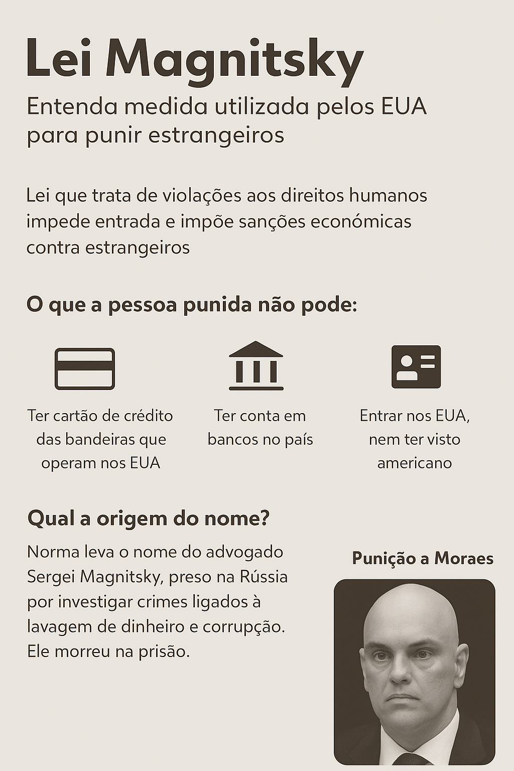 🔎 De acordo com o governo norte-americano, com essa decisão, todos os bens de Alexandre de Moraes nos Estados Unidos estão congelados, assim como qualquer empresa a ele associada. O ministro também está impedido de realizar transações com indivíduos e empresas dos EUA — incluindo o uso de cartões de crédito emitidos por instituições americanas.