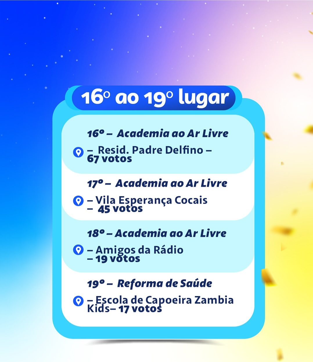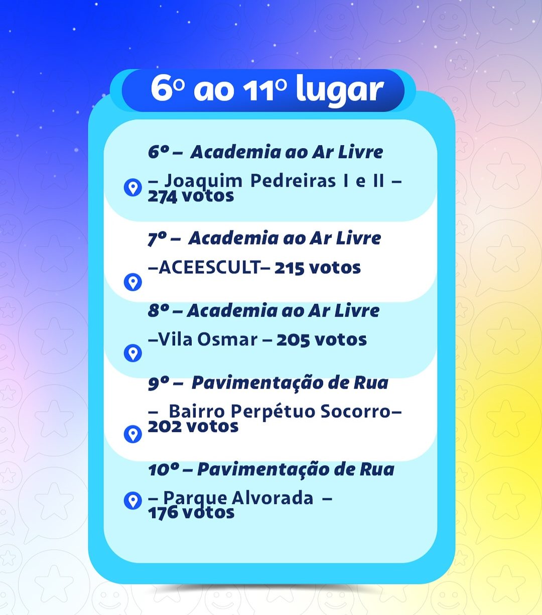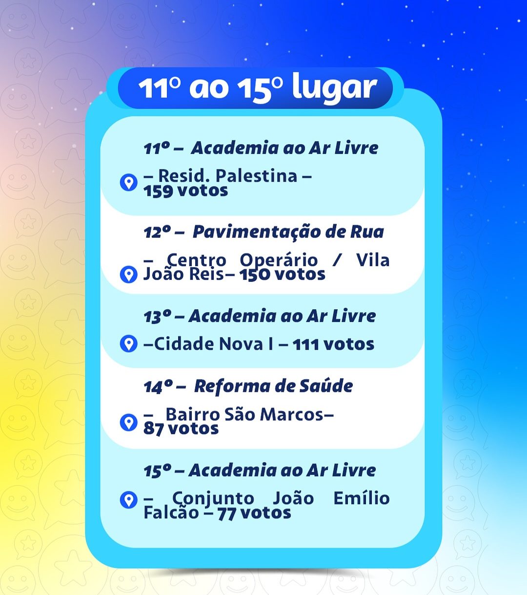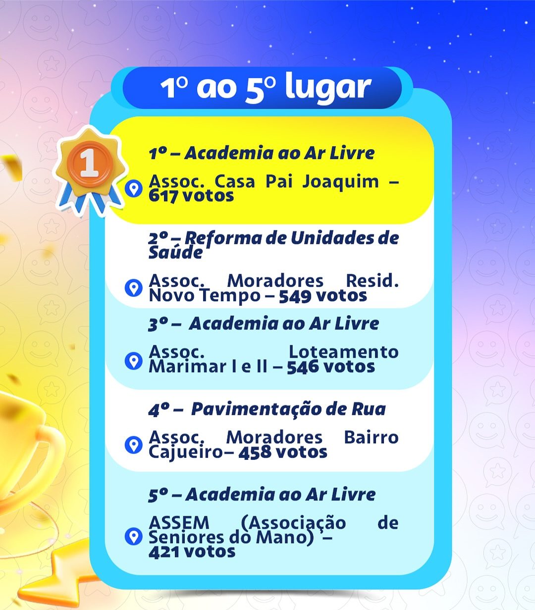 As organizações comunitárias apresentaram suas propostas, que passaram por uma avaliação técnica, documental e orçamentária. As que atenderam aos requisitos foram disponibilizadas para a votação popular, que ocorreu de forma online.
