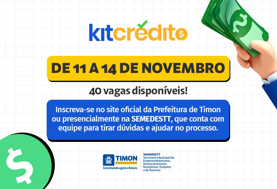 A Prefeitura de Timon abriu inscrições para o Programa Kit Crédito, que oferece 40 vagas para pequenos empreendedores. O edital foi lançado nesta segunda-feira (10) e as inscrições ficam abertas de 11 a 14 de novembro, no site oficial da Prefeitura ou presencialmente na sede da Secretaria de Empreendedorismo (SEMEDESTT).