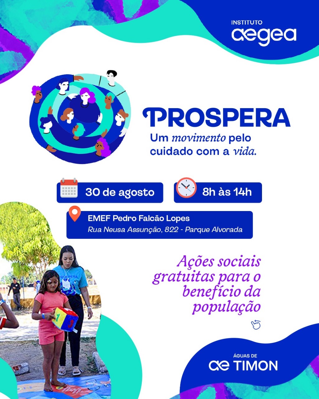 No sábado que se aproxima, dia 30 de agosto, os residentes de Timon poderão desfrutar de uma programação especial voltada para o cuidado e bem-estar, por meio do evento “Prospera – Um movimento pelo cuidado com a vida”. Organizadora do evento, a Águas de Timon, em parceria com o Instituto Aegea, que é a divisão responsável por iniciativas de impacto socioambiental da Aegea, fará a realização na EMEF Pedro Falcão Lopes, localizada no bairro Parque Alvorada, das 8h às 14h.