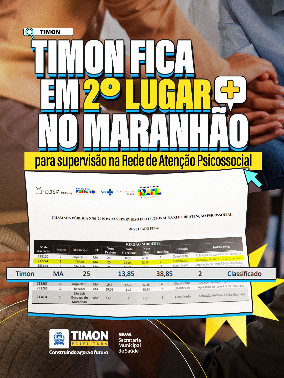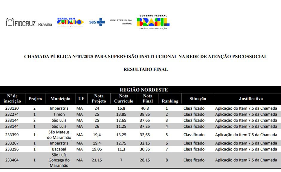 O município de Timon alcançou destaque nacional ao conquistar o 2º lugar no Maranhão na chamada pública realizada pela Fundação Fiocruz em parceria com o Ministério da Saúde. A seleção, voltada para a Supervisão Institucional na Rede de Atenção Psicossocial (RAPS), contou com a participação de diversos municípios e destinou nove vagas para o estado.